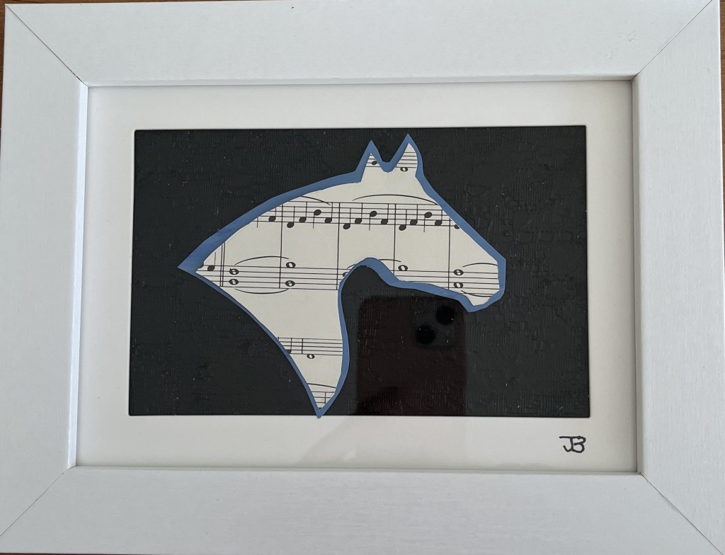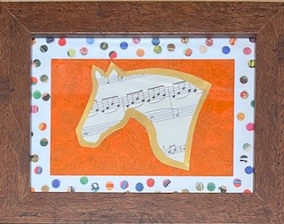 I’m listening to an interview with Austin Kleon because I enjoyed his trilogy: Steal Like an Artist, Show Your Work, and Keep Going. In this interview, he references his blog, so I take a look at it. One post shows a collage and I think, hey, I could show my work. Here’s a trio of mixed media pieces I entered into a local (unjuried) art show and listed for $25 each. The frames are 5″ x 7″. The music paper is layered onto file folder paper painted with acrylic. The horse shapes are layered onto lace which is painted with acrylic on file folder paper.