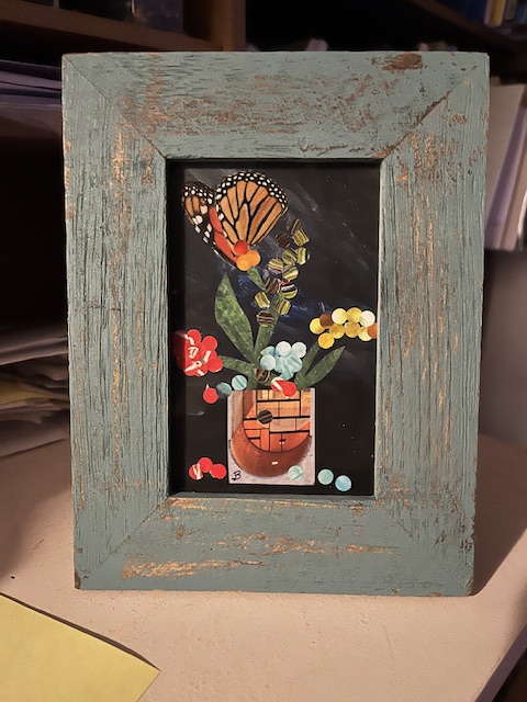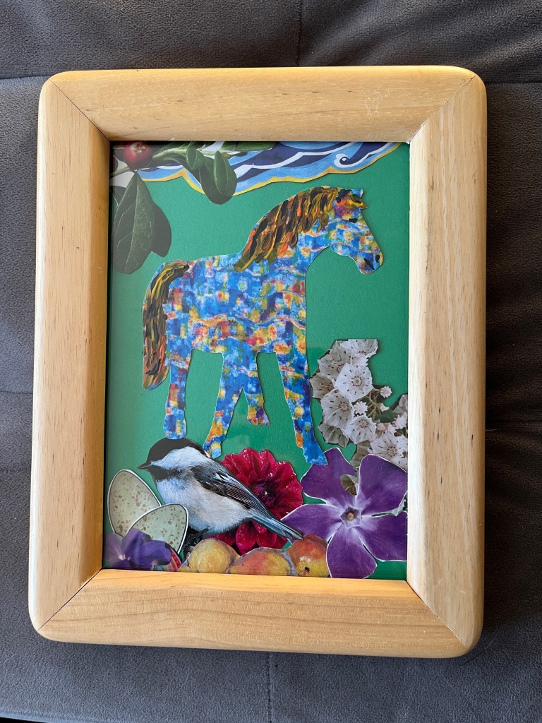 As I play with collage, I realize one reason I love childrens’ picture book illustration is that every image tells a story. My collage is just an arrangement of objects and colors without a message. Something to think about. Here’s a few in frames from local thrift stores.